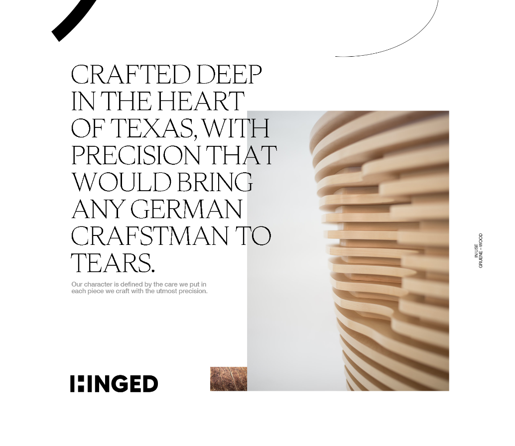 The rebrand reflects the fully customizable cabinet systems crafted by Hinged, and juxtaposes the technological precision used to craft the cabinets with Texas passion and pride.