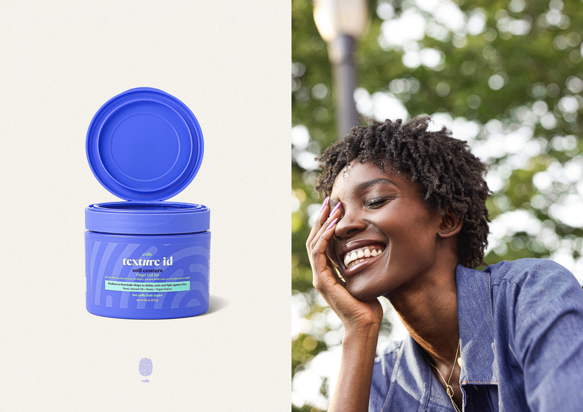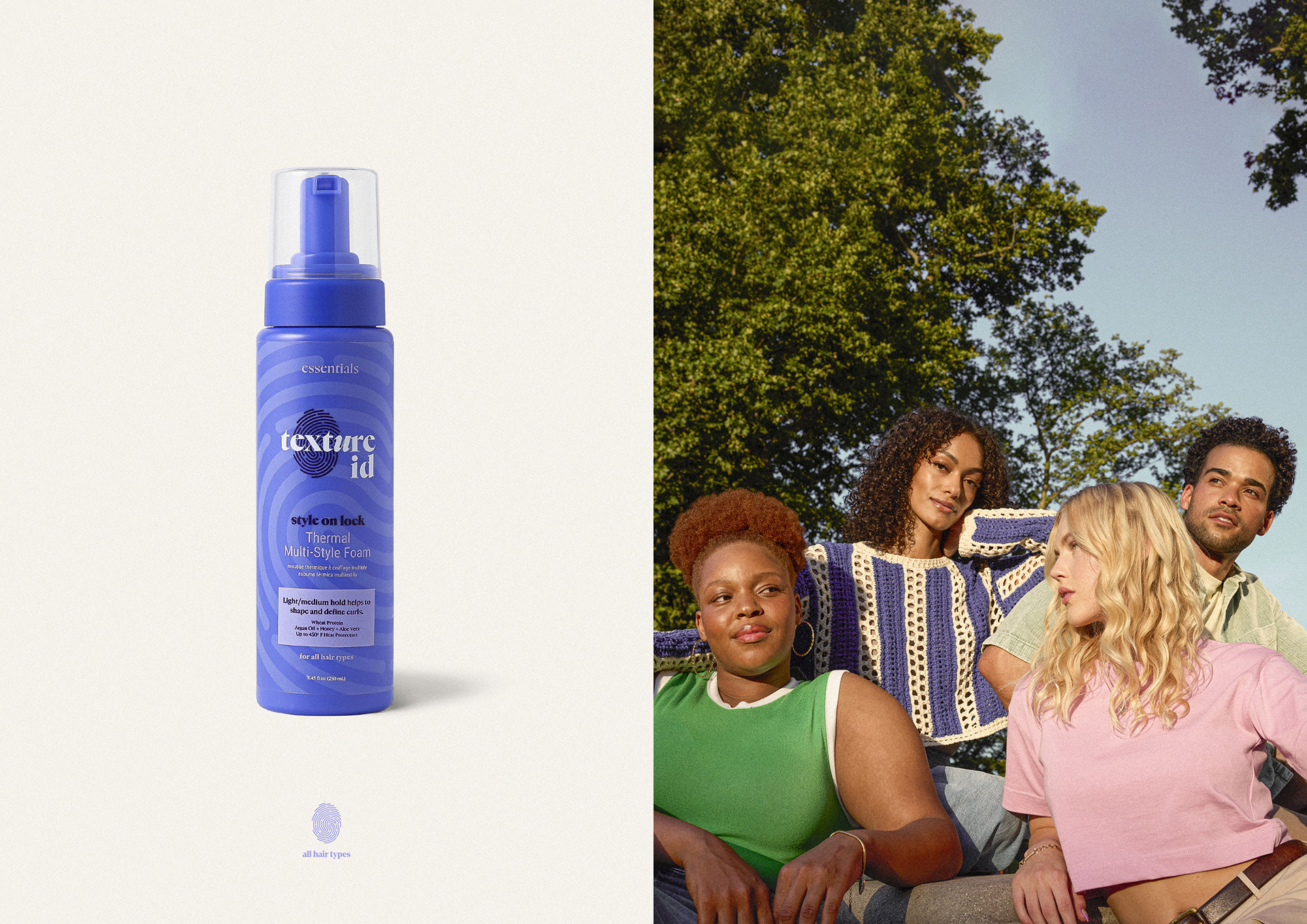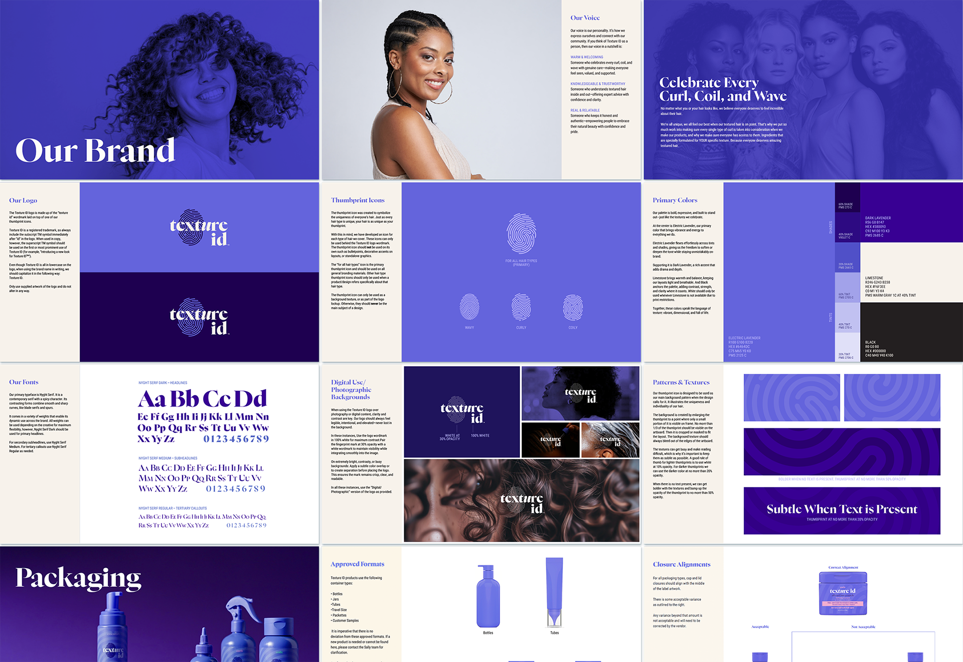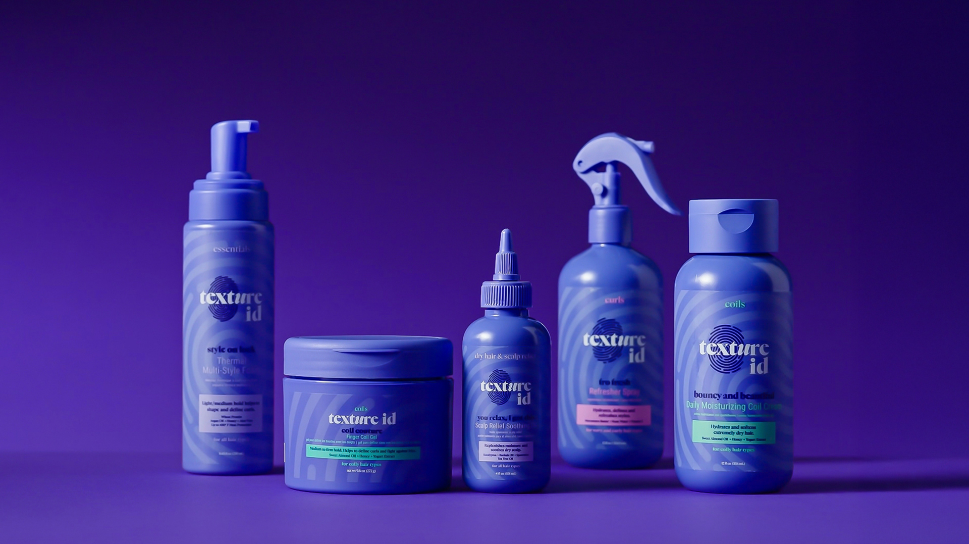 Each Texture ID product line is defined by a custom thumbprint, paired with a distinct color and integrated into the core logo system. While the mark remains consistent, the thumbprint and palette shift across textures, creating clarity at shelf and reinforcing that every hair type requires a different approach.